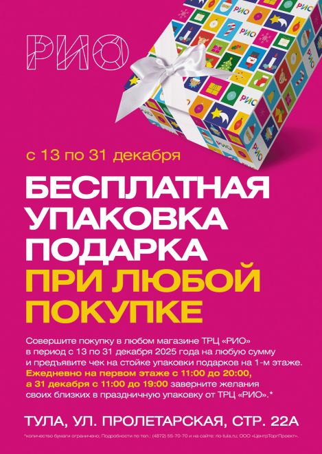 С 13 по 31 декабря 2025г. с 11:00 до 20:00 при ЛЮБОЙ покупке в ТРЦ РИО БЕСПЛАТНАЯ упаковка Вашего подарка!Стойка упаковки подарков расположена на 1м этаже (около нашей красивой
