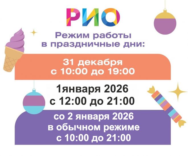 В праздничные дни ТРЦ РИО работает по следующему графику:31 декабря с 10:00 - 19:00